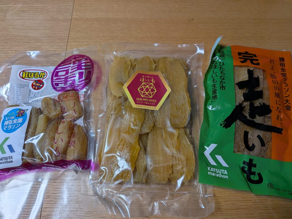今回のレースには珍しく家族も同行してくれました。マラソンの応援するわけじゃなく、干し芋目当てで、会場で売っている干し芋を沢山購入していました。勝田全国マラソンが行われるひたちなか市は干し芋でも有名のようです。家族は寒さで大変そうでしたが、自分がレースで走っているときはドンキに行ったり、図書館に行ったりして楽しんだみたいです。