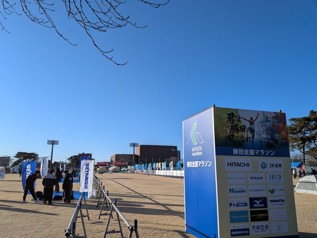 この日は晴天でしたが寒波の影響でとても寒い一日でした。またこの大会は毎年風が強いみたいです。「君よ勝田の風になれ」というマラソンの大会讃歌まであるようです。