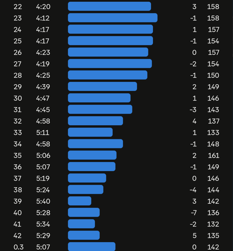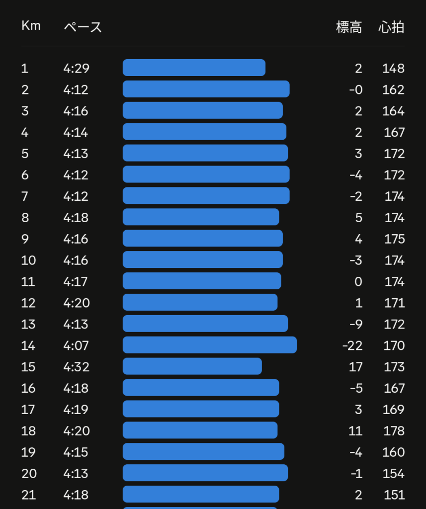 タイムを見ると、まあまあいい感じに見えますが、強風のため少し無理をしてペースを維持していたと思います。30キロの前あたりから、脚が上がらなくなって、あちゃーって感じのペースになってしまいました。